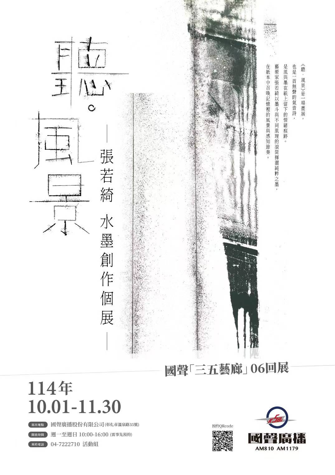 國聲廣播公司三五藝廊於10月1日起,推出第6回展,誠摯邀請您一同走入藝術家張若綺的《聽.風景》水墨創作個展,感受一場用「聽覺」觀看風景的獨特藝術,體會「山境」與「畫境」的對視。